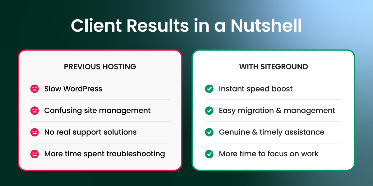 In short, as a customer, I recognized Siteground’s stellar service and culture of highly skilled yet kind and thoughtful staff and was instantly inspired. It was a huge moment in my life. Really, it was life changing. I was able to look within and see how amazing it felt to have such a gentle support team guide me through the complexities of the web and I understood that I was important and my questions were real and what I struggled with was every day work for them. This gave me the confidence and support to take on more clients and focus on customer service and feel safe that there is a team behind me that genuinely cares about the people it serves. Siteground is the best host in the world, not only because of their servers or technology but because of the people that make up this very special company. From its leaders of each department down to it’s new hires, you can rest assured that this team is here to support you and give you their highest value whether you are a small business that needs quality hosting or a webmaster with lots of clients.
