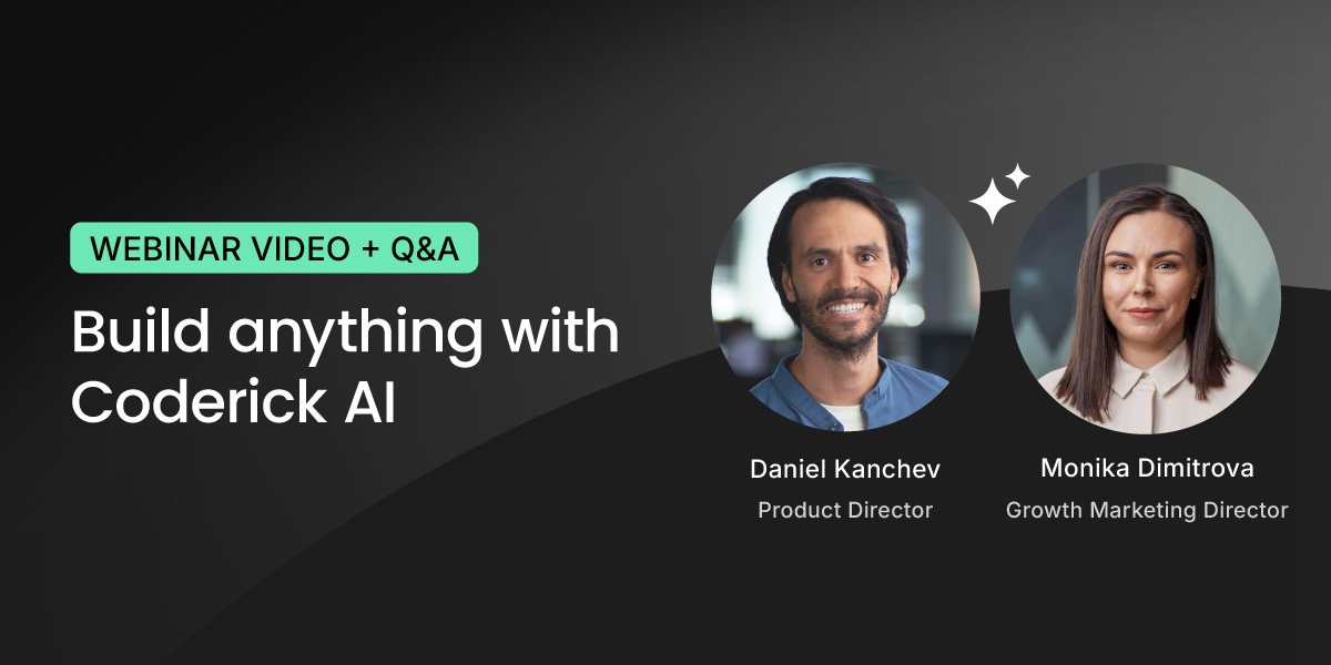 In our recent live webinar, our Growth Marketing Director Monika Dimitrova and our Product Director Daniel Kanchev put Coderick AI to the test: taking three projects from a blank screen to fully functioning applications, in real-time.